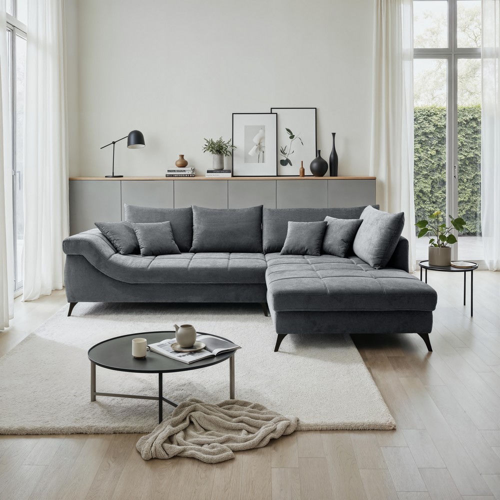Die Wohnlandschaft Paris II präsentiert sich in einem eleganten Anthrazit-Bezug und verbindet modernes Design mit wohnlichem Komfort. Die großzügige Stellfläche von ca. 317 x 98 x 228 cm bietet viel Platz zum Entspannen, Lesen oder für gesellige Abende.