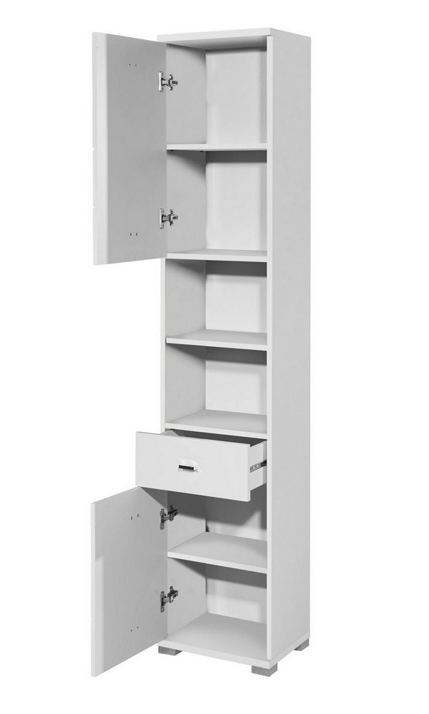 Der Hochschrank Peter verfügt über zwei Türen, zwei Einlegeböden, zwei offene Fächer und einen Schubkasten – alles, was du für eine geordnete Aufbewahrung brauchst. Die Türen können entweder links oder rechts montiert werden, sodass du den Schrank flexibel an deine Bedürfnisse anpassen kannst.