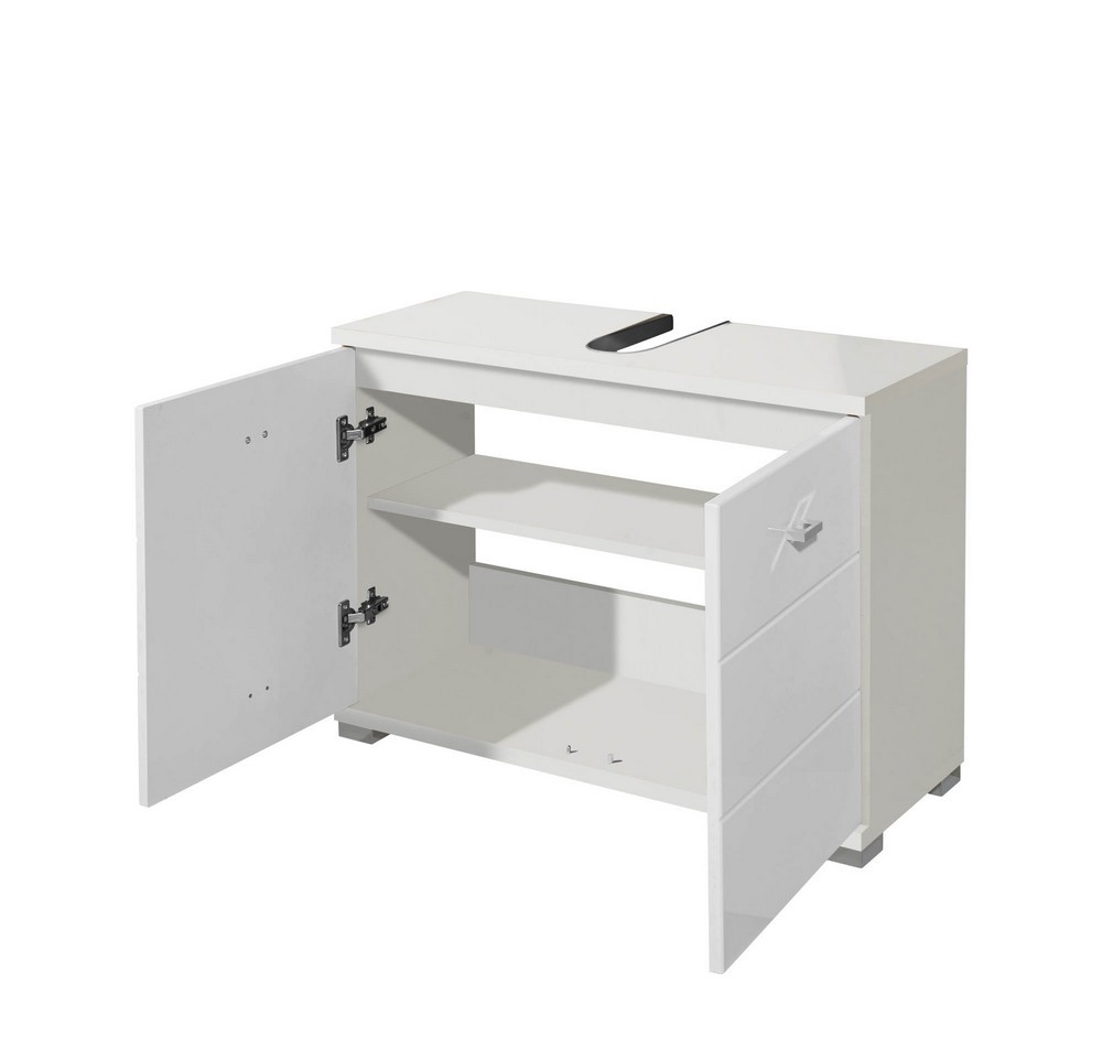 Die Front aus MDF in Weiß Hochglanz und der Korpus in Weiß verleihen dem Unterschrank eine helle, moderne Optik, die sich hervorragend in jedes Badezimmer einfügt und für eine angenehme Atmosphäre sorgt.