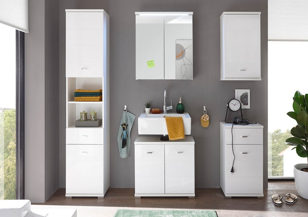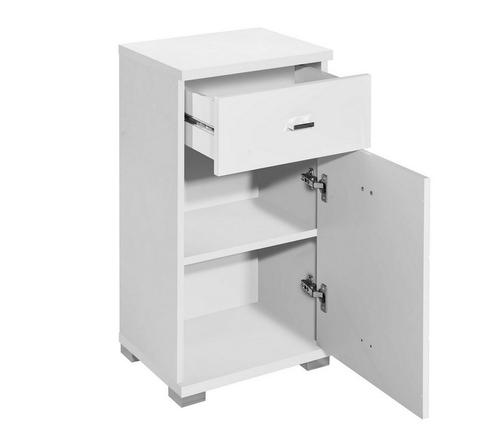 Die Badkommode Peter vereint modernes Design mit praktischer Funktionalität. Mit ihrer hochglänzenden Front in MDF Weiß tiefzieh und dem weißen Korpus fügt sie sich harmonisch in jedes Badezimmer ein. Dank des kompakten Formats von ca. 38 x 73 x 30 cm (B/H/T) bietet sie mit einem Schubkasten, einer Tür und einem Einlegeboden ausreichend Stauraum für deine Badutensilien. Perfekt, um Handtücher, Pflegeprodukte oder andere Essentials ordentlich zu verstauen.