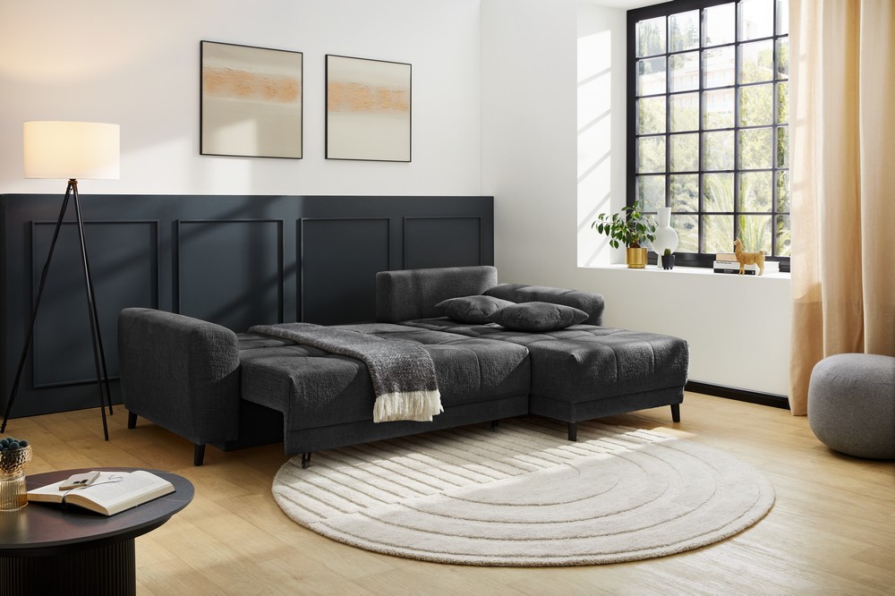 Die Polsterung aus Wellenschaum sorgt für ein komfortables Sitzgefühl, während die integrierte Schlaffunktion mit einer Liegefläche von ca. 145 x 204 cm spontane Übernachtungsgäste bequem unterbringt. Ein praktischer Bettkasten bietet zusätzlichen Stauraum. Die Couch ist rechts oder links montierbar und somit flexibel anpassbar. Der Rücken ist echt bezogen und erlaubt freie Platzierung im Raum. Mit einer Sitzhöhe von ca. 45 cm sowie einer variablen Rückenhöhe von ca. 74–86 cm bietet die Polsterecke hohen Komfort.