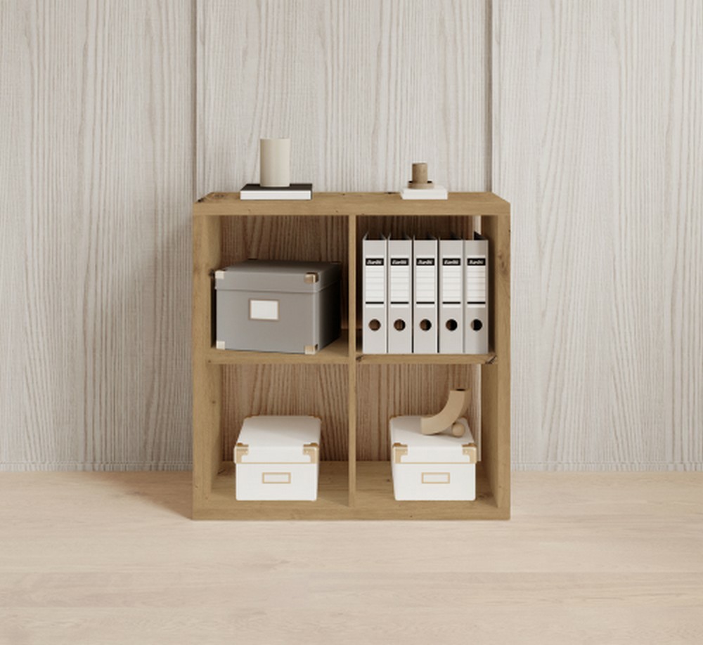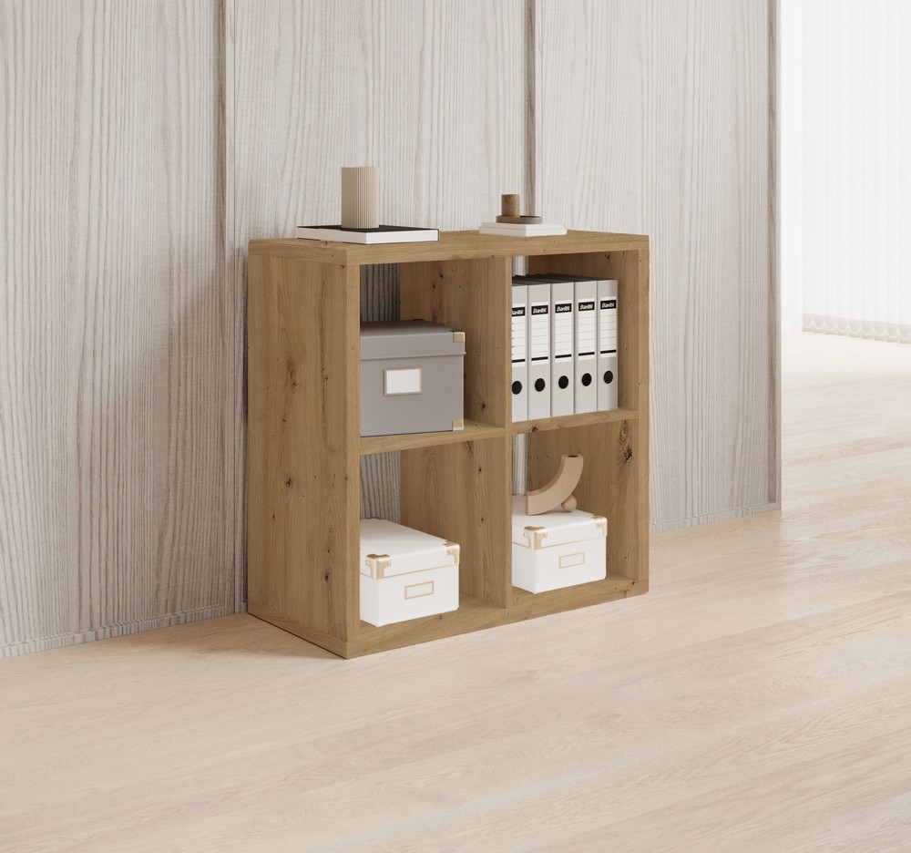 Vier offene Fächer bieten Platz für Bücher, Deko oder Aufbewahrungsboxen und lassen sich sowohl funktional als auch dekorativ nutzen. Ob freistehend als Raumteiler oder wandnah als Regal – Portia überzeugt durch zeitloses Design und praktische Anwendungsmöglichkeiten auf kleinem Raum.