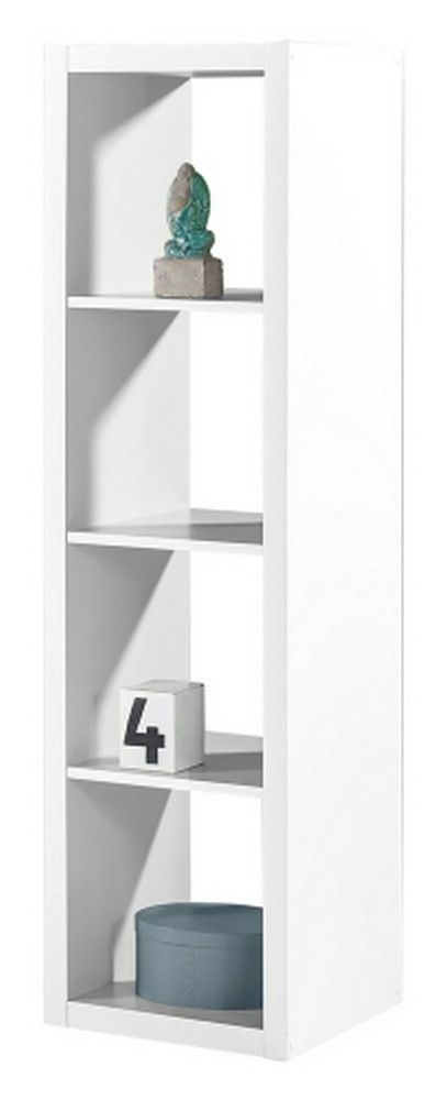 Der weiße Korpus und die Front verleihen dem Möbelstück eine zeitlose, moderne Optik, die sich mühelos in verschiedene Einrichtungsstile integrieren lässt. Die vier offenen Fächer bieten ausreichend Platz für Bücher, Dekoration oder Aufbewahrungsboxen und ermöglichen eine übersichtliche Organisation. Dank der stabilen Konstruktion ist der Raumteiler langlebig und vielseitig einsetzbar.