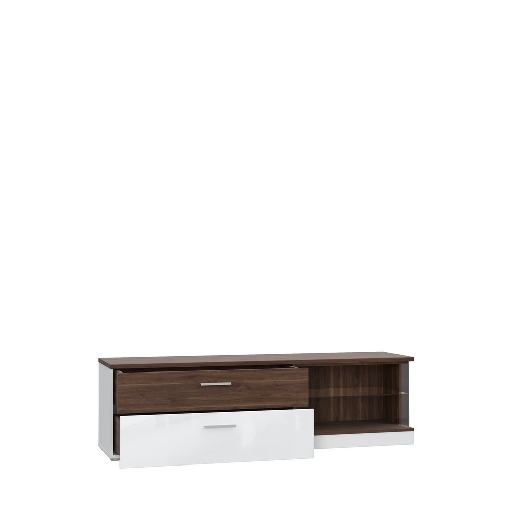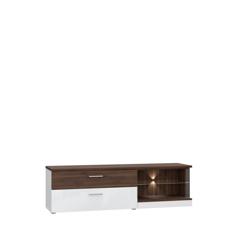Die Kombination aus Bakersfield Walnuss und Weiß Hochglanz sorgt für eine moderne und stilvolle Optik, die deinem Raum eine edle Atmosphäre verleiht. Die zwei Schubkästen bieten zusätzlichen Stauraum, um kleinere Gegenstände ordentlich und griffbereit aufzubewahren.