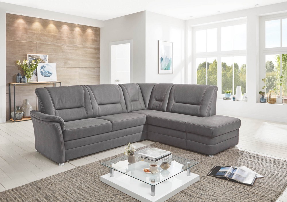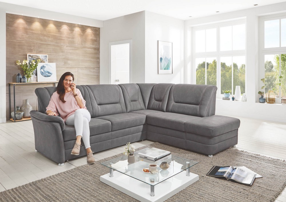 Setz auf zeitloses Design und bewährte Qualität mit der Raven Wohnlandschaft – ein stilvoller Mittelpunkt für dein Zuhause. Der Stoff in Grey mit feinem Kontrastfaden in Beige verleiht der Wohnlandschaft einen eleganten Look, der sich harmonisch in viele Wohnstile einfügt.