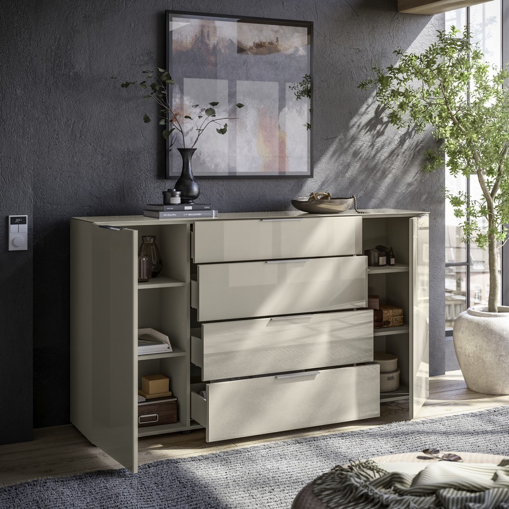 Der Korpus in Kaschmir harmoniert wunderbar mit der Front und Oberplatte aus Kaschmir Glas, was der Kommode eine elegante, hochwertige Optik verleiht.