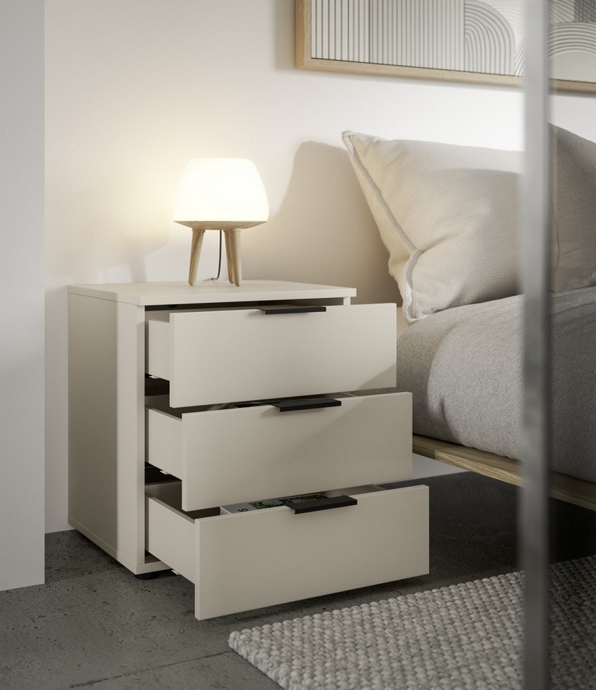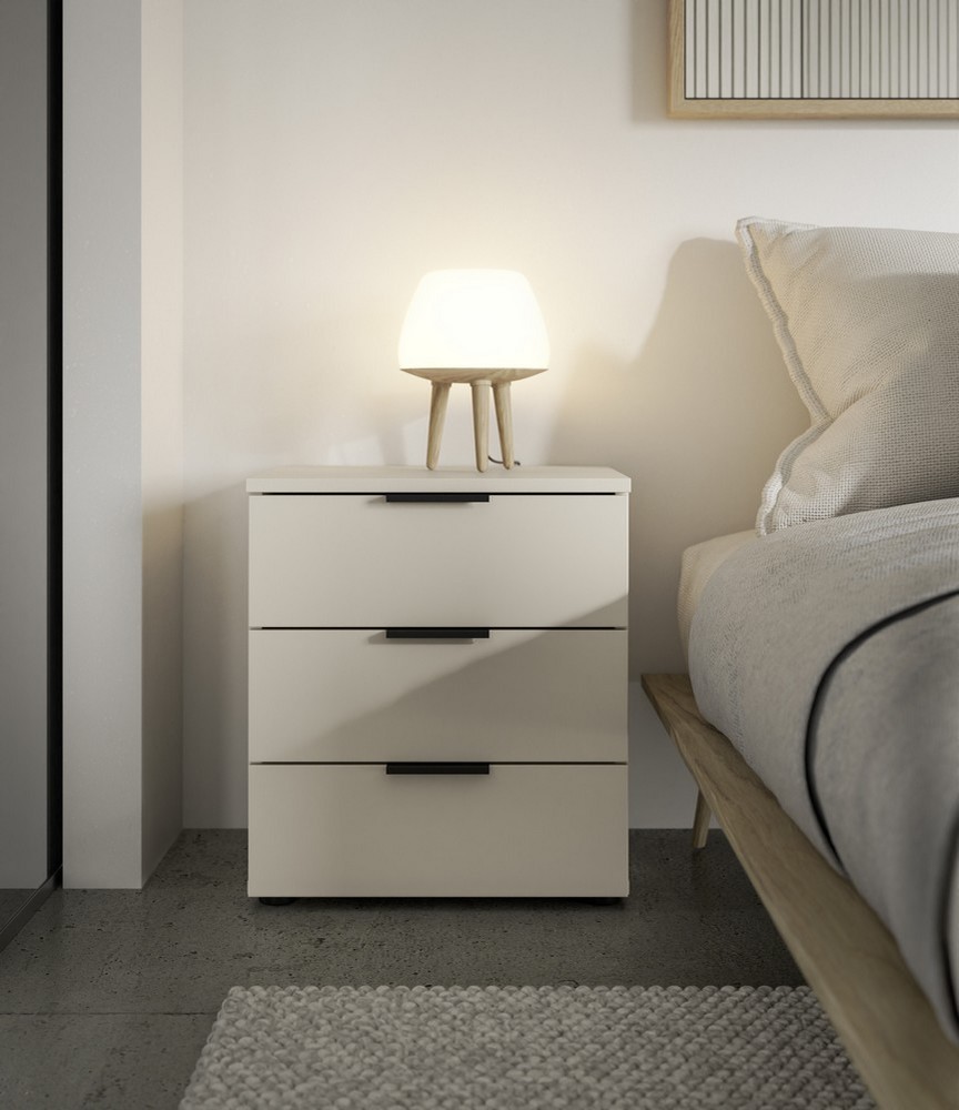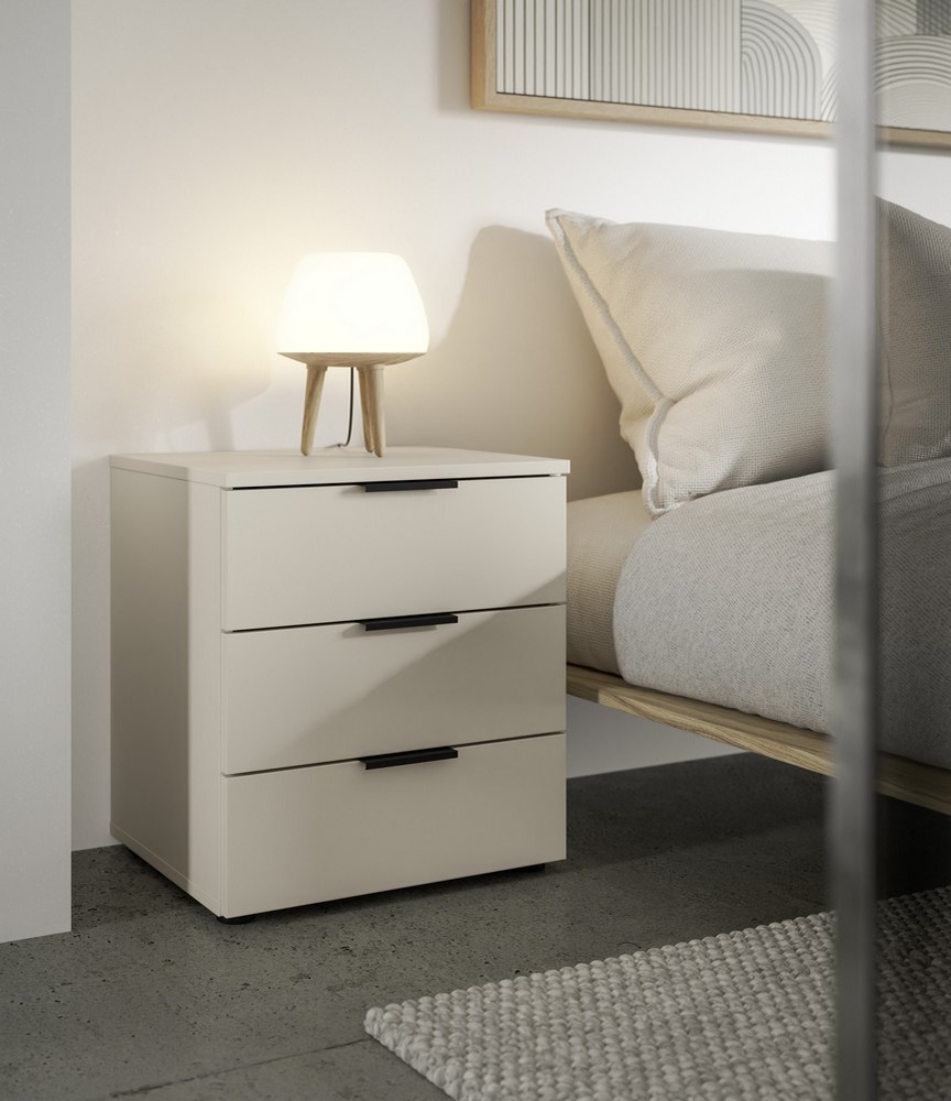 Der Korpus und die Front in Kaschmir verleihen der Kommode eine edle und zeitlose Optik. Die drei geräumigen Schubkästen bieten ausreichend Stauraum für persönliche Gegenstände und sorgen für eine geordnete Aufbewahrung. Die schwarzen Lip-Griffe aus Kunststoff ermöglichen ein komfortables Öffnen und setzen dezente Akzente. Die schwarzen Kunststofffüße sorgen für Stabilität und unterstreichen das moderne Design.