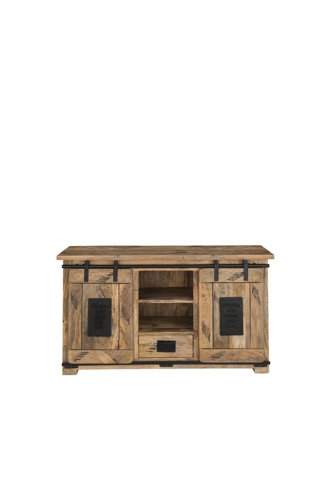 Die TV-Kommode Slyder Original aus massivem Mango-Holz kombiniert rustikalen Charme mit funktionaler Eleganz. Die markante Maserung und die vintage-behandelte Oberfläche machen jedes Stück zu einem Unikat, das durch seinen natürlichen Charakter und seinen industriellen Look überzeugt.