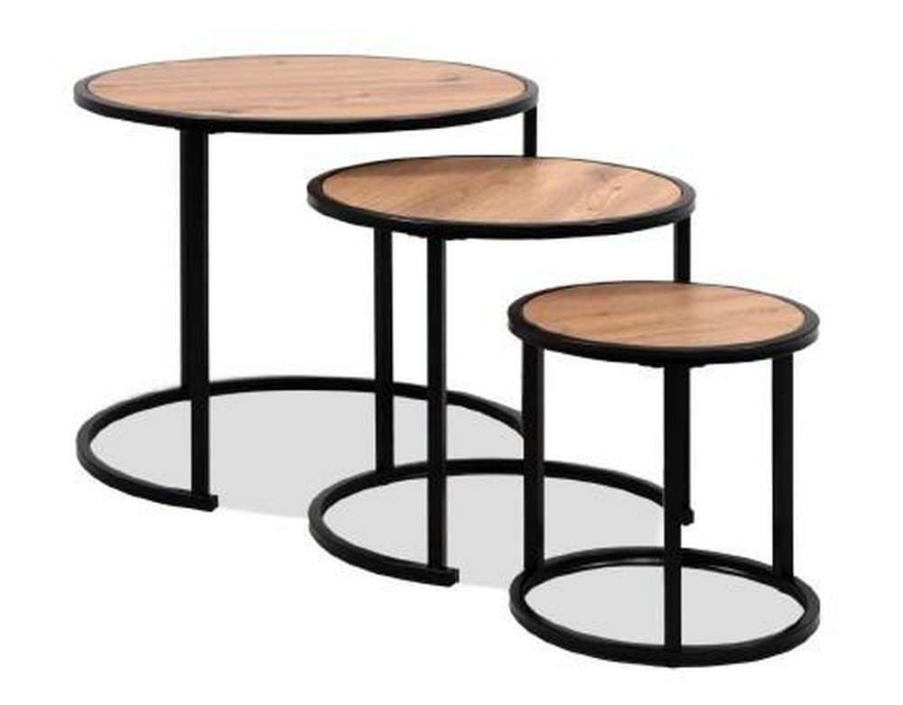 Das Tremaine Beistelltisch-Set (3-teilig) überzeugt durch sein modernes Design mit natürlicher Note. Die Tischplatten in Artisan Eiche Nachbildung in Kombination mit dem schwarzen Metallgestell sorgen für einen stilvollen Industrial-Look, der sich vielseitig in Ihre Einrichtung integrieren lässt. Die drei Tische mit unterschiedlichen Größen (ca. 50x46x50 cm, 40x39x40 cm, 30x31x30 cm) bieten flexible Einsatzmöglichkeiten – ob einzeln als Beistelltisch, im Ensemble dekorativ arrangiert oder platzsparend ineinander geschoben.
