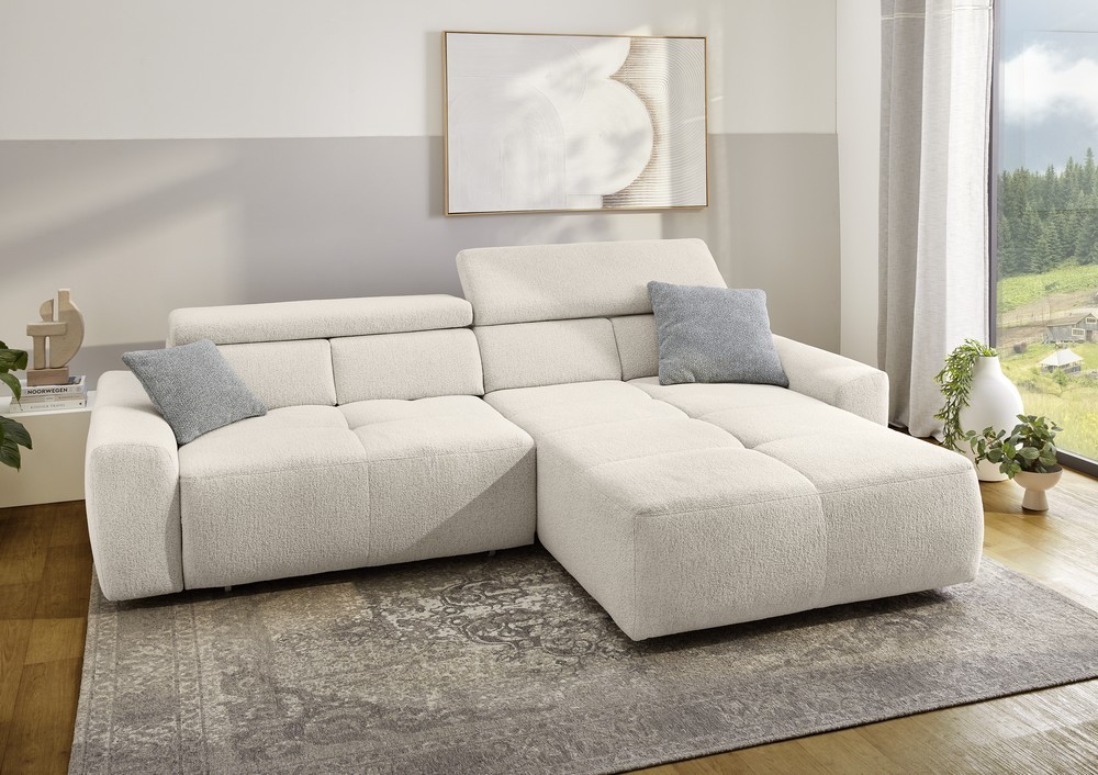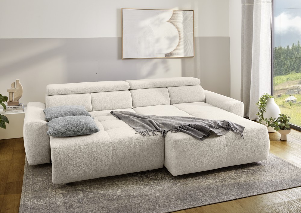 Der elektromotorische Auszug im Sitz und in der Ottomane erweitert die Sitztiefe um bis zu 60 cm und verwandelt das Sofa im Handumdrehen in eine großzügige Liegefläche von ca. 242 x 116 cm. Die mehrfach verstellbaren Kopfteilelemente ermöglichen individuelle Entspannung. Die hochwertige Polsterung aus Schaum auf Wellenunterfederung sorgt für langanhaltenden Sitzkomfort.