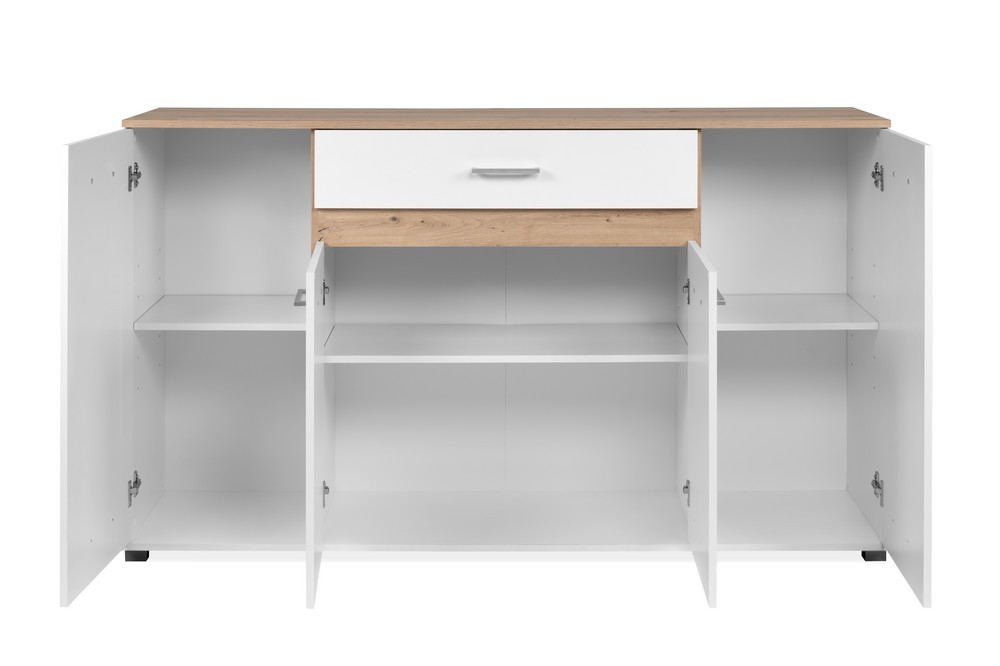 Ausgestattet mit vier Türen und einem Schubkasten, bietet das Sideboard großzügigen Stauraum für Geschirr, Bücher, Deko oder Alltagsgegenstände. Die melaminbeschichtete Oberfläche ist strapazierfähig und leicht zu reinigen. ABS-Kanten sorgen für zusätzliche Widerstandsfähigkeit im täglichen Gebrauch. Die griffigen Kunststoffelemente und Füße runden das moderne Erscheinungsbild ab.