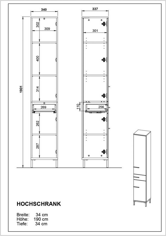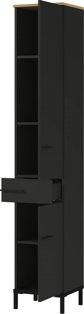 Der Hochschrank Yorgos kombiniert modernes Design mit praktischer Funktionalität und bietet eine stilvolle Stauraumlösung für dein Badezimmer. Mit seinen Maßen von ca. 34 x 190 x 34 cm (B/H/T) ist er besonders schmal und platzsparend, bietet jedoch viel Stauraum für Pflegeprodukte, Handtücher oder Reinigungsmittel.